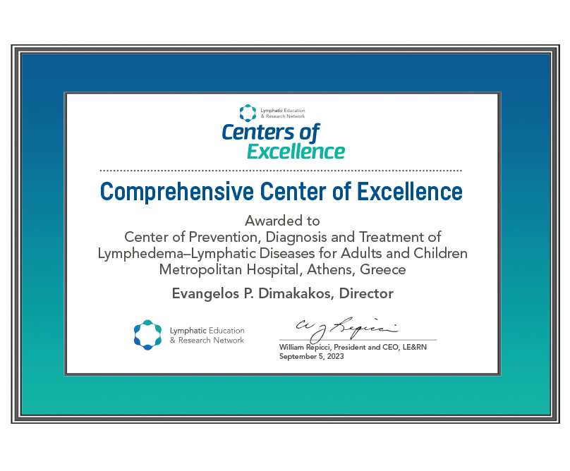 Μια ακόμα διεθνής διάκριση για το Metropolitan Hospital καθώς το Κέντρο Πρόληψης, Διάγνωσης και Θεραπείας Λεμφοιδήματος–Λεμφικών Παθήσεων για Παιδιά και Ενήλικες αναδείχθηκε «Comprehensive Center of Excellence» από το διεθνές δίκτυο για τη Λεμφολογική Εκπαίδευση και Έρευνα Λεμφικών Παθήσεων (LE&RN) και αποτελεί πλέον ένα από τα καλύτερα Ολιστικά Κέντρα Αντιμετώπισης Λεμφοιδήματος και Λεμφικών Παθήσεων παγκοσμίως.
