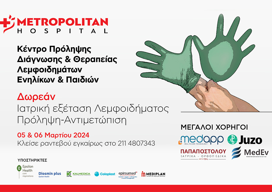 Το Metropolitan Hospital και το Κέντρο Πρόληψης Διάγνωσης και θεραπείας Λεμφοιδημάτων -Λεμφικών παθήσεων Ενηλίκων και Παιδιών στα πλαίσια της Παγκόσμιας Ημέρας ενάντια στο Λεμφοίδημα στις 6 Μαρτίου 2024 έχει την χαρά να προσφέρει εντελών δωρέαν κλινική εξέταση στον ασθενή, συμβουλές προς αποφυγή εμφάνισης λεμφοιδήματος και σημαντικές οδηγίες για την πλήρη και αποτελεσματική θεραπεία λεμφοιδήματος από τον Εξειδικευμένο Ιατρό Λεμφολόγο και Διευθυντή του Κέντρου, Πρόεδρου της Παγκόσμιας Λεμφολογικής Εταιρείας κ. Ευάγγελο Δημακάκο και την ομάδα του στις 5 και 6 Μαρτίου από τις 09:30 έως τις 14:30.