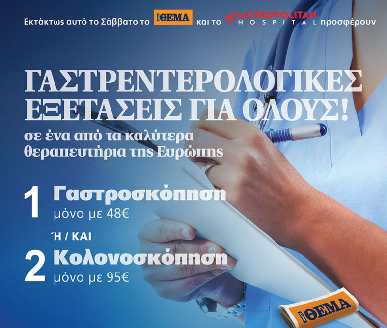 Εκτάκτως αυτό το Σάββατο 29 Απριλίου, το Πρώτο Θέμα και το Metropolitan Hospital, θέλοντας να τονίσουν την αξία και τη σημασία της πρόληψης, προσφέρουν σε όλους τους αναγνώστες του ΘΕΜΑτος βασικές εξετάσεις σε προνομιακή τιμή.